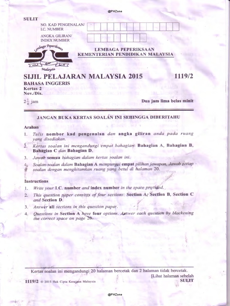 . PENTAKSIRAN DIAGNOSTIK AKADEMIK SBP 2015 PERCUBAAN SIJIL PELAJARAN MALAYSIA BAHASA INGGERIS Kertas 2 2 jam 15 minit JANGAN BUKA KERTAS SOALAN INI SEHINGGA DIBERITAHU Arahan. Semoga perkongsian bahan-bahan rujukan panduan bahan pembelajaran dan pengajaran contoh-contoh karangan sumber rujukan SPM Sijil Pelajaran Malaysia tingkatan 4 tingkatan 5 dalam post di blog Bumi Gemilang berguna dan dapat membantu para pelajar dan pengguna. Bahasa Inggeris English.